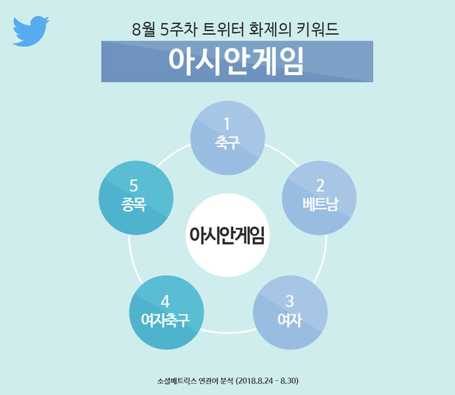 한편, 트위터가 다음소프트와 함께 지난 한 주 간(8월 24일 ~ 8월 30일) 트위터상에서 이슈가 된 주요 키워드를 분석한 결과, ‘아시안게임’이 화제의 키워드를 차지했다.