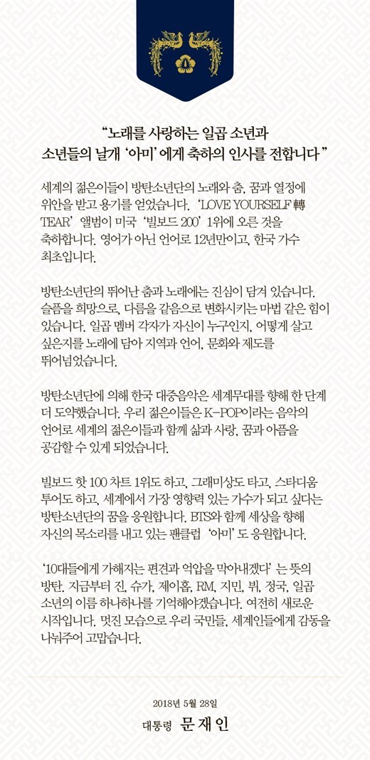 문재인 대통령은 SNS를 통해 "미국 빌보드 200 1위에 오른 걸 축하합니다. 방탄소년단에 의해 한국 대중음악은 세계무대를 향해 한 단계 더 도약했습니다. 방탄소년단의 뛰어난 춤과 노래에는 진심이 담겨 있습니다. 멋진 모습으로 우리 국민들, 세계인들에게 감동을 나눠주어 고맙습니다"라는 글을 전하며 기뻐했다.