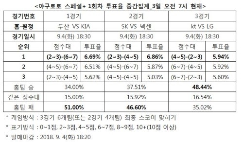 KBO 3경기 대상 야구토토 스페셜 플러스 1회차 투표율 중간집계