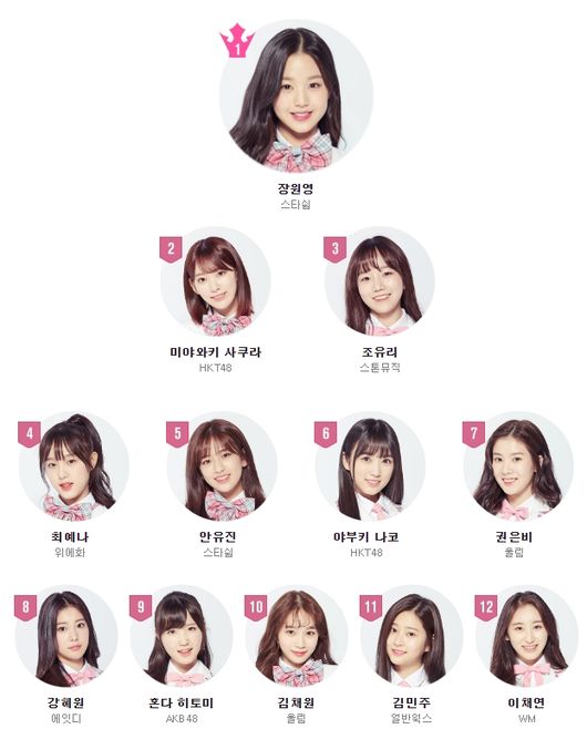 아이즈원은 열 두 빛깔의 별들이 하나가 되듯, 소녀들이 하나가 되는 순간이라는 뜻이다. 장원영(스타쉽) 미야와키 사쿠라(HKT48) 조유리(스톤뮤직) 최예나(위에화) 안유진(스타쉽) 야부키 나코(HKT48) 권은비(울림) 강혜원(에잇디) 혼다 히토미(AKB48) 김채원(울림) 김민주(얼반웍스) 이채연(WM) 등이 소속됐다.