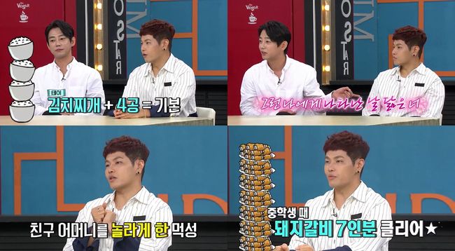 대식가 테이는 이날 자신의 식사량에 대해 밝혀 모두의 놀라움을 자아냈다. 대량의 김치찌개에 밥 4개는 기본으로 먹는다는 테이는, 나윤권도 만만치 않게 많이 먹는다며 나윤권의 숨겨진 식사량을 공개했다. 이에 나윤권은 어렸을 적 친구의 어머니가 자신의 식사량에 대해 놀란 적이 있다며 “돼지갈비를 혼자 7인분을 먹었다”고 밝혀 모두를 깜짝 놀라게 했다. 서로의 식사량에 대해 폭로하던 그들을 보던 김숙은 “밥정이 많이 쌓였다는 거죠.”라고 하며 기승전 열애설의 토크를 선보여 두 사람을 좌절케 했다. 4일 방송. /parkjy@osen.co.kr