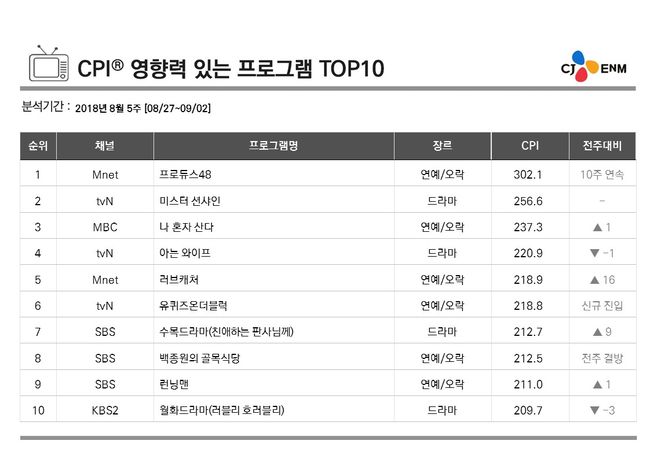 4일 발표된 콘텐츠 영향력 지수(CPI)에 따르면 Mnet 예능 '프로듀스48'가 8월 5주(8/27~9/2) 영향력 있는 프로그램 순위 1위를 차지했다. 지난달 31일 파이널 생방송을 끝으로 종영한 것은 물론 12인조 걸그룹 아이즈원을 탄생시켜 화제를 모은 '프로듀스48'가 10주 연속 1위 자리를 수성한 것.