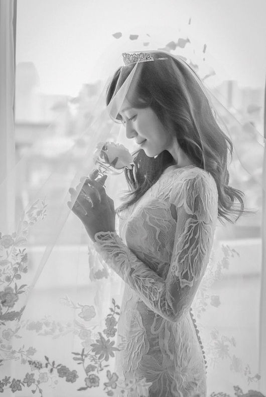 사진 속에서 하시은은 웨딩드레스를 입고 티아라에 베일을 쓴 모습으로 결혼으로 행복한 신부의 표정이 눈길을 끈다.
