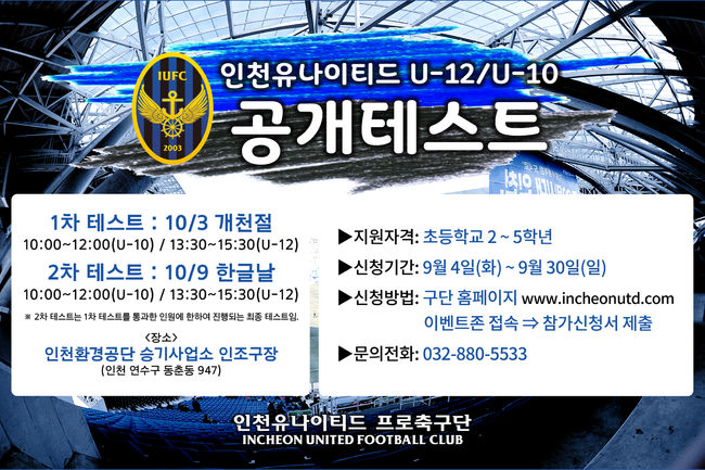 이번 공개 테스트 접수 마감은 9월 30일이며 참가 신청 접수는 인천 구단 홈페이지 공지사항 내 게시글을 통해 온라인으로만 진행할 수 있다. 그밖에 자세한 내용이나 문의 사항이 있으면 인천 구단 홈페이지나 선수단지원팀을 통해 문의하면 된다.