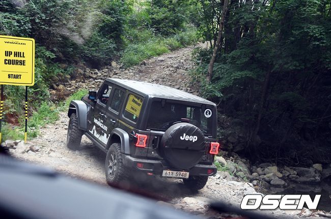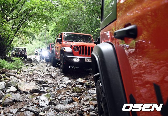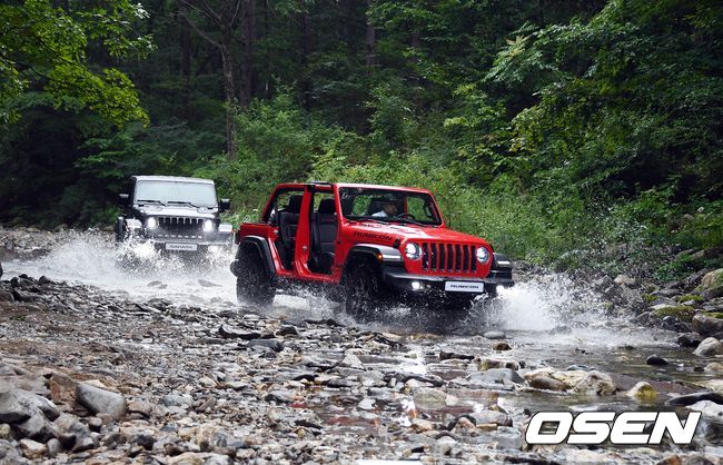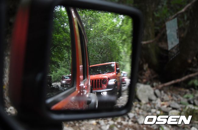 조심스럽게 차를 계곡으로 몰았다. ‘몰았다’기보다는 ‘집어넣었’다. 이 코너의 이름은 ‘락 크롤링’. 계곡물이 흐르는 바위 사이를 꾸물꾸물 뚫고 나갔다. 바위 끝을 미끄러지듯 지나, 첨벙하는 소리와 함께 차체가 물구덩이로 떨어진다. 물보라가 높이 치솟는다. ‘첨벙’ 후엔 또 다시 ‘꿈틀꿈틀’ 나아간다. 결코 멈추지 않았고, 바퀴도 헛돌지 않았다. 올 뉴 랭글러의 도강 능력은 성인의 허벅지 높이인 76cm나 된다.