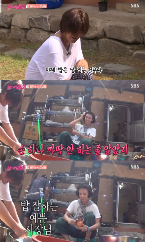 햇볕 아래 쪼그리고 앉아 쌀을 씻는 임재욱에게 박선영은 “그늘에 와서 해”라며 살뜰히 챙겼다. 이 말에 임재욱은 “어차피 어제 땀을 흘렸다”며 털털한 성격을 드러냈다.
