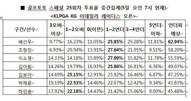 이어 2번 조정민이 58.20%로 뒤를 이었고, 3번 이소영이 55.59%의 언더파 투표율을 기록했다. 반면, 49.03%에 그친 4번 김아림을 비롯해, 김보아(47.25%)와 박채윤(43.83%), 하민송(45.48%)은 언더파 투표율이 다소 저조한 것으로 나타났다.