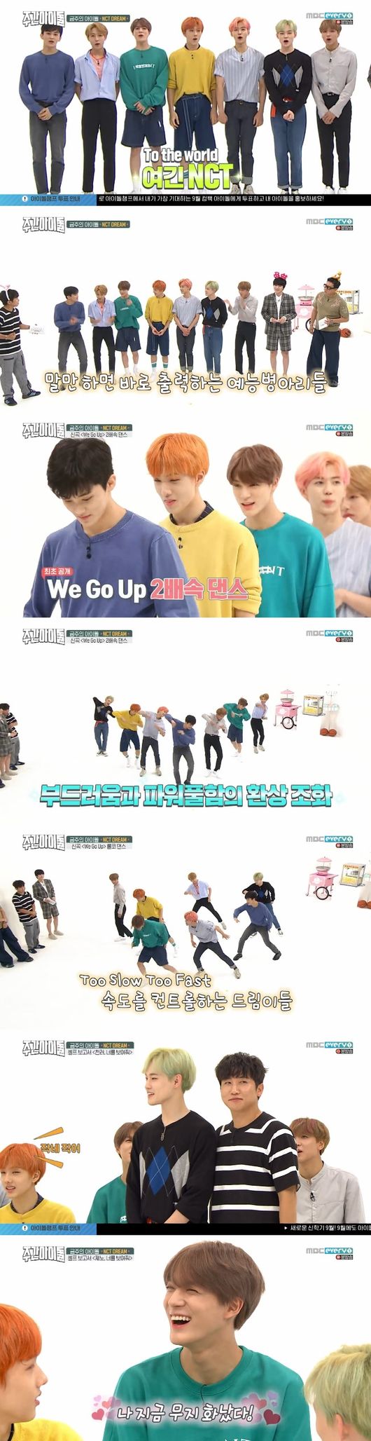 평균나이 18.7세 최강 틴에이저 그룹 NCT 드림을 위해 이날 ‘주간아이돌’꿈과 희망의 엔(N)도시 '드리미 랜드'를 개장했다. NCT 드림은 ‘드리미 랜드’에 초대된 만큼 각자 음색요정 해찬, 머리요정 천러, 사랑요정 재민, 실세요정 지성, 유잼요정이고 싶은 제노, 어깨요정 런쥔, 이마요정 마크라고 자신을 소개했다.