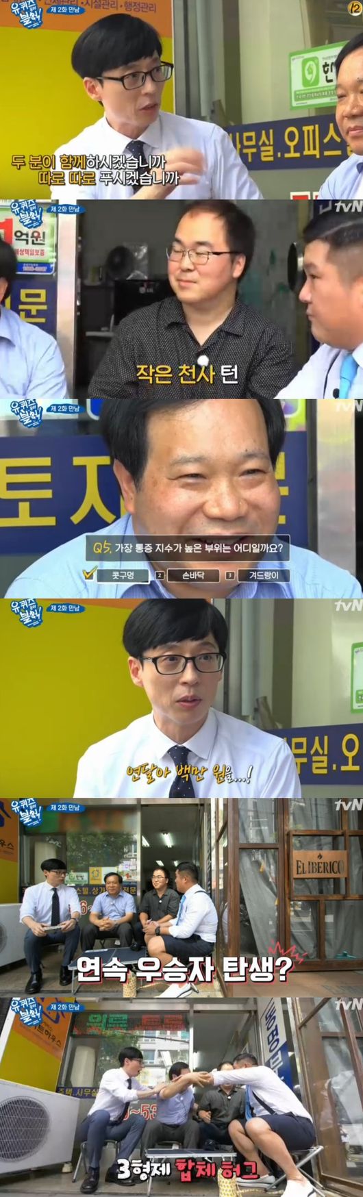 다음은 부동산을 찾아갔다. 천사같은 부동산 주인을 만났다. 특히 100만원을 만나면 기부하겠다고 하자 조세호는 유재석에게 "이런 분에게 건물 매입하셔라"고 말해 웃음을 안겼다. 본격적인 퀴즈를 시작했다. 홍길동전 저자인 허균을 맞히는 것부터 2단계까지 모두 맞혔다. 다음은 ATM에서 M이 뜻하는 의미를 맞히는 것이었고, 부동산 사장은 시민찬스를 썼다. 덕분에 '머신'이란 뜻을 맞히며 통과했다. 4단계는 우리나라에서 최초로 발명된 것이 아닌 것으로 와이파이를 맞혔다. 오스트라이 공학자가 개발했다고. 마지막 문제만 남았다. 다소 어려울 수 있는 질문에 찬스까지 없는 상황. 부동산 사장은 자신감없이 대답했으나, 정답을 맞혔다. 최초로 연달아 백만원을 받는 연속 우승자가 탄생한 것. 두 사람은 기쁨을 함께 나눴다.