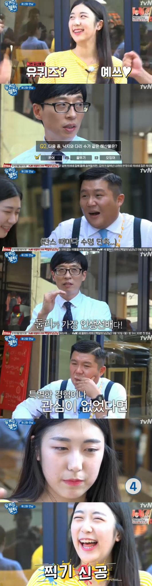 두 사람은 카페를 안내한 여학생에게 다음 퀴즈를 제안했다. 상금을 타면 많은 병원비를 내주신 부모님에게 드리고 싶다는 착한마음을 보였다. 첫번째 문제를 시작했다. 명자의 사단설에서 남을 불쌍히 여기는 마음을 뜻하는 측은지심이란 뜻을 맞혔다. 다음 문제는 조세호 찬스를 이용해 낙지와 다리수가 같은 해산물로 문어를 맞혔다. 조세호는 "얼마전에 문어 먹었다"며 찬스때마다 수명이 단축된다고 해 웃음을 안겼다. 이어 최초로 주민등록증을 발급받은 캐릭터를 맞혀야했다. 바로 둘리였다.