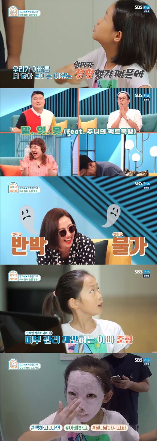 두 딸의 팩트폭격에 박준형은 포기하고 방송 출연을 위해 피부 관리를 하자고 했고 주니와 혜이는 팩을 하며 좋아했다. 이를 본 김지혜는 “팩을 하고 예뻐지니까 좋아하는 거 봐라”라며 웃었다.