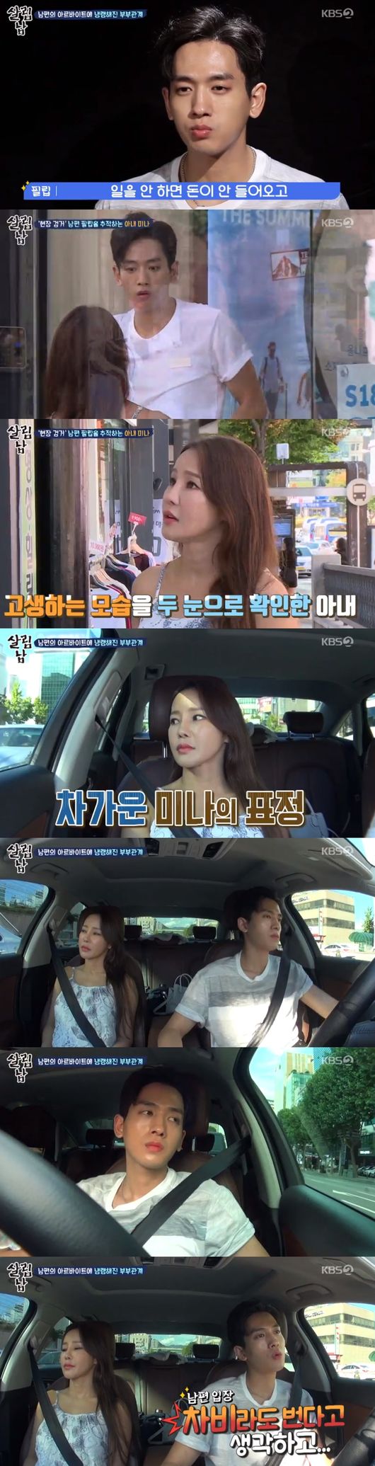 미나는 답답해하며 "자기 액션스쿨 일산까지 5시간 걸려서 왔다갔다 하지, 녹음 준비해야지"라고 말했다. 필립은 "차비 번다고 생각하고.."라고 미나의 눈치를 살폈다.
