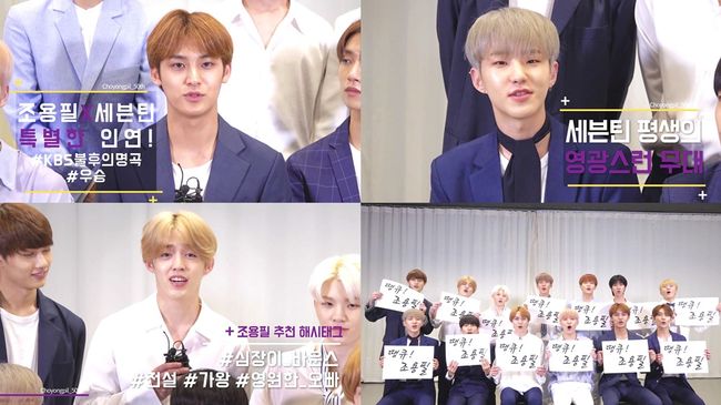 세븐틴은 “KBS ‘불후의 명곡’ 조용필 선생님 편을 출연하면서 선생님을 처음 만나 뵙게 되었는데, 정말 영광스럽게도 저희가 우승을 했다”고 모두가 기분 좋게 환호를 하며, 조용필과의 특별한 인연에 대해 소개했다.