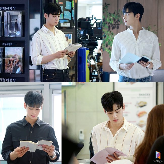 공개된 사진 속 차은우는 쉬는 시간 틈틈이 장소를 가리지 않고 진지하게 대본에 집중하고 있다. 사람이 많은 영화관에서도, 촬영을 위해 분주한 현장에서도 대본을 놓지 않고 집중력을 발휘하는 모습은 드라마 첫 주연으로서의 책임감과 열정이 고스란히 느껴진다.