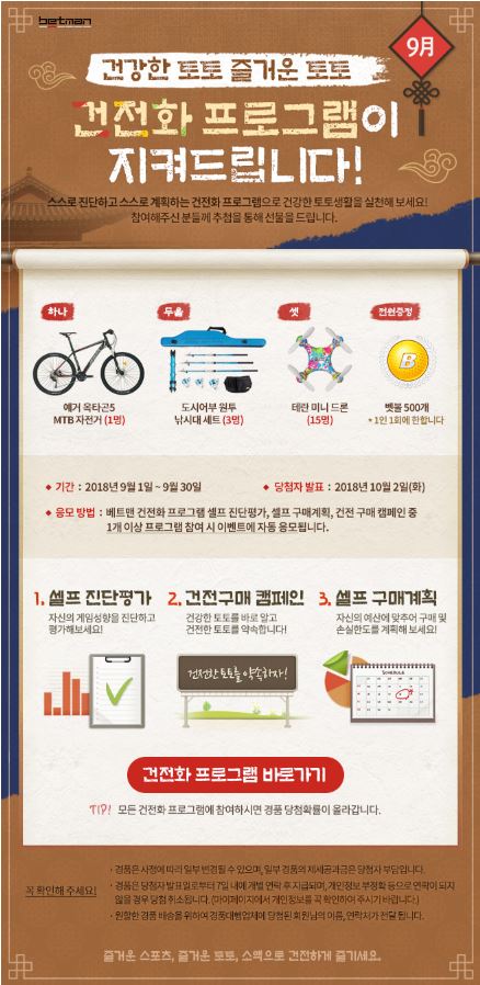 체육진흥투표권 스포츠토토의 공식온라인 발매사이트인 베트맨(www.betman.co.kr)이 9월 건전화 프로그램 이벤트 ‘건강한 토토 즐거운토토, 건전화 프로그램이 지켜드립니다!’를 실시한다.