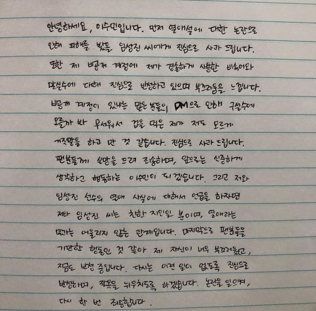 열애설에 ‘욕설 논란’까지 덧붙여진 이수민의 논란은 결국 그의 사과로 종결됐다. 이수민은 이날 밤 자신의 SNS에 "진심으로 반성한다"는 내용의 사과문을 게재했다. 그는 “먼저 열애설에 대한 논란으로 인한 피해를 봤을 임성진 씨에게 진심으로 사과드린다. 제 비공개 계정에 제가 경솔하게 쓴 비속어와 말실수에 대해 진심으로 반성하고 있으며 부끄러움을 느낀다”며 “진심으로 사과드린다. 팬 분들에게 실망을 드려 죄송하다. 앞으로는 신중하게 생각하고 행동하는 이수민이 되겠다”고 사과했다.