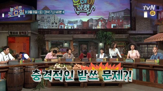 '놀라운 토요일'은 tvN의 주말 버라이어티 프로그램이다. 인기 코너인 '도레미 마켓'에서 신동엽, 박나래, 혜리, 문세윤, 키, 김동현, 한해는 전국 시장의 핫한 음식을 걸고 노래의 특정 부분을 정확히 받아쓰는 미션을 수행한다.