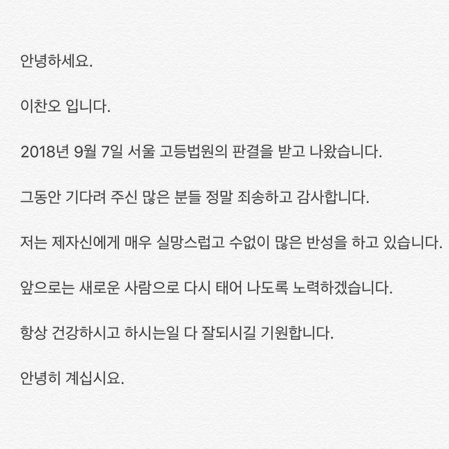 2심에서도 집행유예를 선고받은 이찬오는 7일 자신의 SNS를 통해 심경글을 남겼다. 그는 “2018년 9월 7일 서울 고등법원의 판결을 받고 나왔습니다. 그동안 기다려 주신 많은 분들 정말 죄송하고 감사합니다”라고 밝혔다.