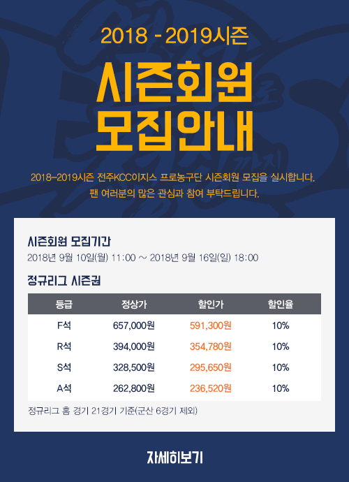 전주 KCC이지스 프로농구단(단장 최형길)이 다가오는 10일 오전 11시부터 16일 오후 6시까지 2018-2019시즌 시즌권 판매를 시작한다.