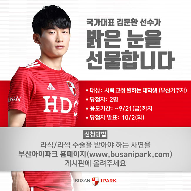 K리그2 부산아이파크의 축구국가대표 김문환 선수가 부산지역 대학생을 위해 시력 교정 치료(라식, 라섹)을 지원한다.