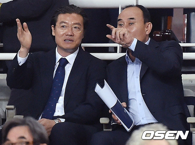 이날 경기 전반이 끝나고 찾아온 반가운 손님이 있었다. 바로 아시안게임 2연패를 달성한 김학범 감독과 코칭스태프.