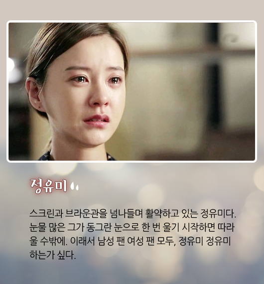 최지우는 눈물이 많은 여배우 중 한 명이다. 청순한 외모에 깊은 눈망울 가득 눈물이 그렁그렁 맺히면 보는 이들까지도 절로 울컥하게 만든다.