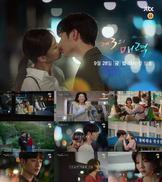 JTBC 새 금토드라마 ‘제3의 매력’(극본 박희권·박은영, 연출 표민수, 제작 이매진아시아, JYP픽쳐스)은 특별하지 않지만 내 눈에는 반짝거리는 서로의 ‘제3의 매력’에 빠진 두 남녀, 온준영(서강준)과 이영재(이솜)가 스물의 봄, 스물일곱의 여름, 서른둘의 가을과 겨울을 함께 통과하는 연애의 사계절을 그릴 12년의 연애 대서사시. 오늘(7일) 공개된 티저 영상에는 준영과 영재의 12년 연애의 순간순간이 포착됐다.