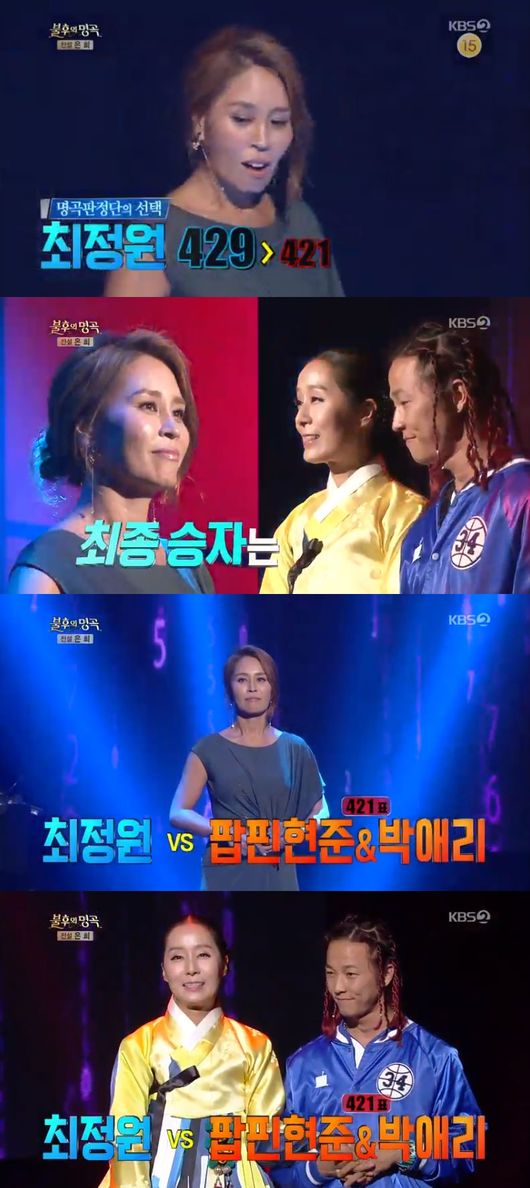 이로써 팝핀현준, 박애리 부부는 3연승을 거뒀다. 이에 마지막 순서로 나선 최정원은 합창단과 함께 감동의 무대를 꾸몄다. 최종 우승은 최정원(429점)에게 돌아갔다. / besodam@osen.co.kr