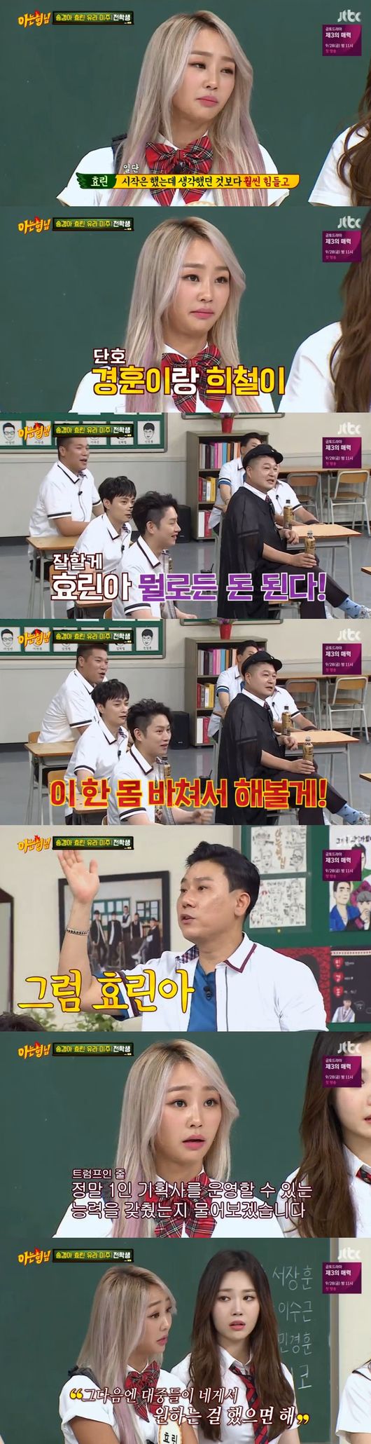1인 기획사를 차렸다는 효린은 "생각보다 훨씬 힘들다"면서 잘못하면 모두 피해볼까봐 무게감과 부담감이 크다고 했다. 이때, 누굴 데려가고 싶냐고 묻자, 효린은 "경훈이랑 희철이 데려가고 싶다"고 대답했다.