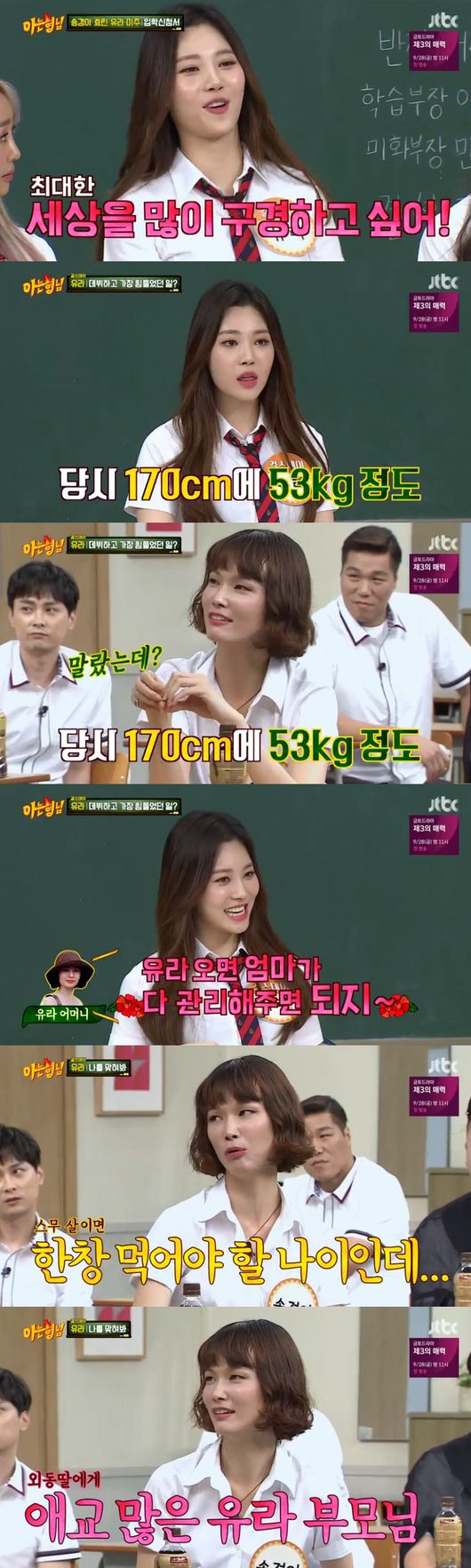 본격적으로 유라부터 '나를 맞혀봐'가 시작했다. 유라는 데뷔하고 가장 힘들었던 일을 맞혀보라고 했다. 바로 다이어트를 못하면 울산 집으로 내려가라고 했던 말이었다. 유라는 "내가 170cm인데 당시 53kg였다, 대표님은 51kg까지 빼라고 하더라"면서 "결국 쫓겨나 울면서 울산에 내려갔다"고 전했다. 심지어 이미 데뷔한 상태였다고. 유라는 "엄마가 샐러드로 관리해주겠다고 했다, 그래서 5일만에 51kg 만들어서 서울 올라왔다"꼬 말했다. 이에 모델 송경아는 "안 먹고 살빼기 안 좋다, 탄력이 떨어진다"고 걱정했다.