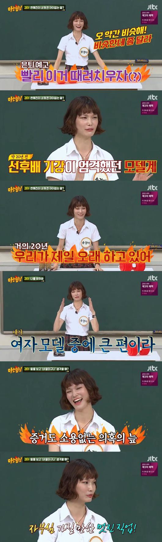 이어 모델 계기를 물었다. 송경아는 "어릴 때부터 키가 컸다 초등학교6학년때 168cm"라면서 "친구들이 놀려서 몸을 접고 다녔다, 이걸 본 어머니가 자세 교정 목적으로 모델학원 등록했다"면서 콤플렉스 극복하다가 일을 하게 된 케이스를 전해 눈길을 끌었다.