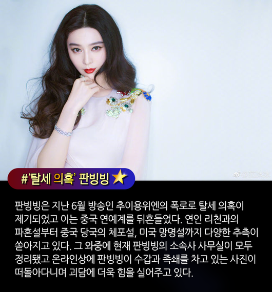 중국 최고 톱스타로 국내에서도 중국 대표 미녀로 잘 알려진 판빙빙은 지난 6월 방송인 추이용위엔의 폭로로 탈세 의혹이 제기되었고 이는 중국 연예계를 뒤흔들었다.