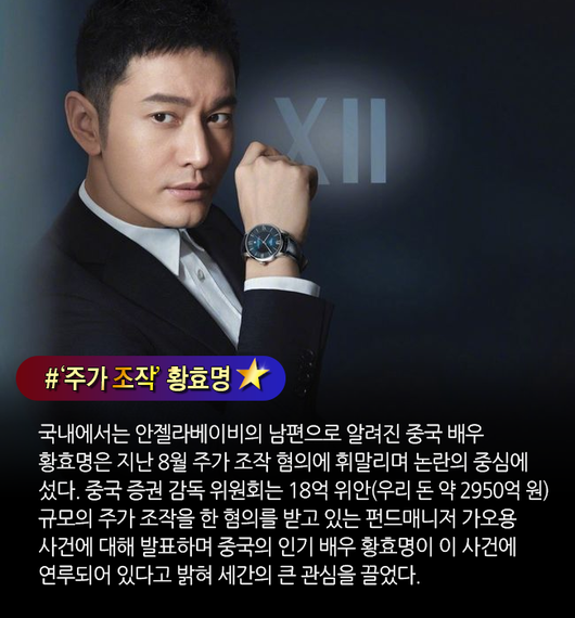 국내에서는 안젤라베이비의 남편으로 알려진 중국 배우 황효명은 지난 8월 주가 조작 혐의에 휘말리며 논란의 중심에 섰다. 중국 증권 감독 위원회는 18억 위안(우리 돈 약 2950억 원) 규모의 주가 조작을 한 혐의를 받고 있는 펀드매니저 가오용 사건에 대해 발표하며 중국의 인기 배우 황효명이 이 사건에 연루되어 있다고 밝혀 세간의 큰 관심을 끌었다.