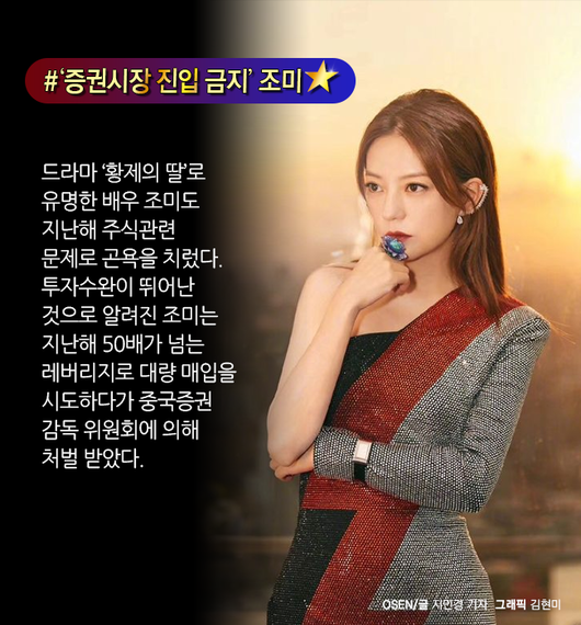 드라마 ‘황제의 딸’로 유명한 배우 조미도 지난해 주식 관련 문제로 곤욕을 치렀다. 투자수완이 뛰어난 것으로 알려진 조미는 지난해 50배가 넘는 레버리지로 대량 매입을 시도하다가 중국증권 감독 위원회에 의해 처벌 받았다.