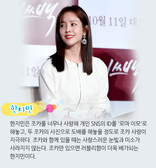 한지민은 조카를 너무나 사랑해 개인 SNS의 ID를 '로마 이모'로 해놓고, 두 조카의 사진으로 도배를 해놓을 정도로 조카 사랑이 지극하다. 조카와 함께 있을 때는 사랑스러운 눈빛과 미소가 사라지지 않는다. 조카만 있으면 러블리함이 더욱 배가되는 한지민이다.