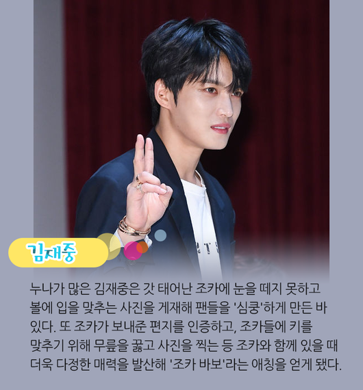 누나가 많은 김재중은 갓 태어난 조카에 눈을 떼지 못하고 볼에 입을 맞추는 사진을 게재해 팬들을 '심쿵'하게 만든 바 있다. 또 조카가 보내준 편지를 인증하고, 조카들에 키를 맞추기 위해 무릎을 꿇고 사진을 찍는 등 조카와 함께 있을 때 더욱 다정한 매력을 발산해 '조카 바보'라는 애칭을 얻게 됐다.