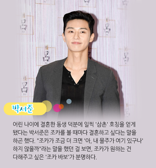 어린 나이에 결혼한 동생 덕분에 일찍 '삼촌' 호칭을 얻게 됐다는 박서준은 조카를 볼 때마다 결혼하고 싶다는 말을 하곤 했다. "조카가 조금 더 크면 '아, 내 물주가 여기 있구나' 하지 않을까"라는 말을 했던 걸 보면, 조카가 원하는 건 다해주고 싶은 '조카 바보'가 분명하다.
