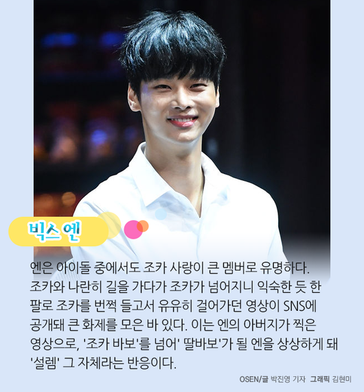 엔은 아이돌 중에서도 조카 사랑이 큰 멤버로 유명하다. 조카와 나란히 길을 가다가 조카가 넘어지니 익숙한 듯 한 팔로 조카를 번쩍 들고서 유유히 걸어가던 영상이 SNS에 공개돼 큰 화제를 모은 바 있다. 이는 엔의 아버지가 찍은 영상으로, '조카 바보'를 넘어' 딸바보'가 될 엔을 상상하게 돼 '설렘' 그 자체라는 반응이다. /parkjy@osen.co.kr