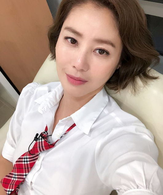 공개된 사진 속 김성령은 JTBC '아는 형님' 촬영장에서 교복을 입고 카메라를 응시하고 있다. 흰 셔츠에 빨간 체크무늬 넥타이로 멋을 낸 김성령은 변함없이 빛나는 미모를 뽐내고 있다.