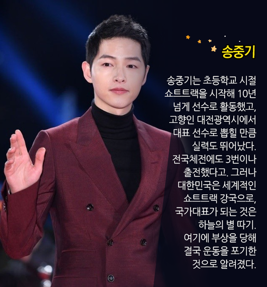 송중기는 초등학교 시절 쇼트트랙을 시작해 10년 넘게 선수로 활동했고, 고향인 대전광역시에서 대표 선수로 뽑힐 만큼 실력도 뛰어났다. 전국체전에도 3번이나 출전했다고. 그러나 대한민국은 세계적인 쇼트트랙 강국으로, 국가대표가 되는 것은 하늘의 별 따기. 여기에 부상을 당해 결국 운동을 포기한 것으로 알려졌다. 만약 송중기가 실제 쇼트트랙 국가대표 선수가 됐다면 동계올림픽 '빙탄소년단'의 센터 선수로 아이돌 못지않은 인기를 누리지 않았을까 싶다.