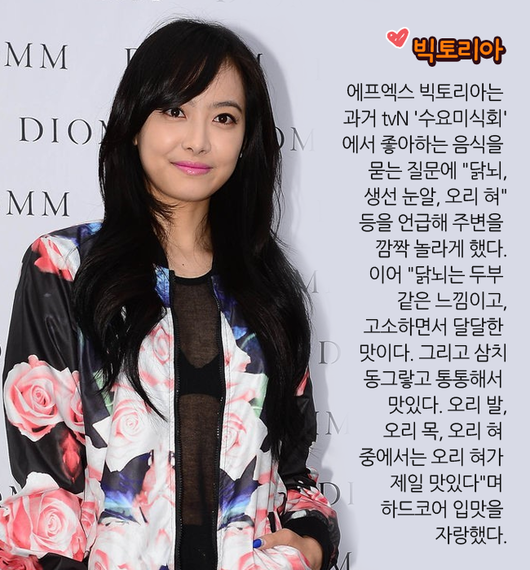 에프엑스 빅토리아는 과거 tvN '수요미식회'에서 좋아하는 음식을 묻는 질문에 "닭뇌, 생선 눈알, 오리 혀" 등을 언급해 주변을 깜짝 놀라게 했다. 이어 "닭뇌는 두부 같은 느낌이고, 고소하면서 달달한 맛이다. 그리고 삼치 눈알은 동그랗고 통통해서 맛있다. 오리 발, 오리 목, 오리 혀 중에서는 오리 혀가 제일 맛있다"며 하드코어 입맛을 자랑했다.