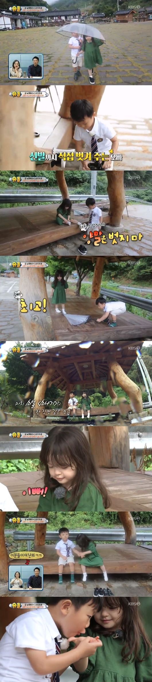오두막에 앉은 시안이는 나은이의 신발을 벗겨주고, 서로의 손에 묻은 물기를 닦아 주고, 후후 불어주면서 '꽁냥꽁냥'한 모습을 보였다. 마치 소설 '소나기'를 연상케 했다. 이때 나은이가 "벌레"라고 외치자, 시안이는 우산으로 벌레를 쫓아냈고, 나은이는 "최고" "예뻐"라며 방긋 웃었다.