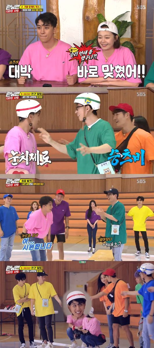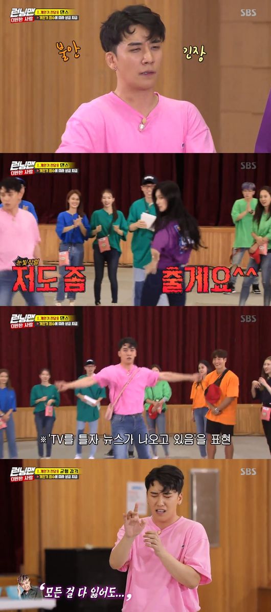 전소민과 함께 팀을 이룬 승리는 개인기 대결에서 물 소리와 뉴스 시그널 음악에 맞춰서 독특한 감성이 드러나는 춤을 보여줬다. 빅뱅에서 댄스 전문 멤버 다운 뛰어난 재능을 자랑했다.