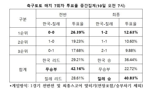 국가대표평가전 한국(홈)-칠레(원정)전 대상 축구토토 매치 7회차 중간집계
