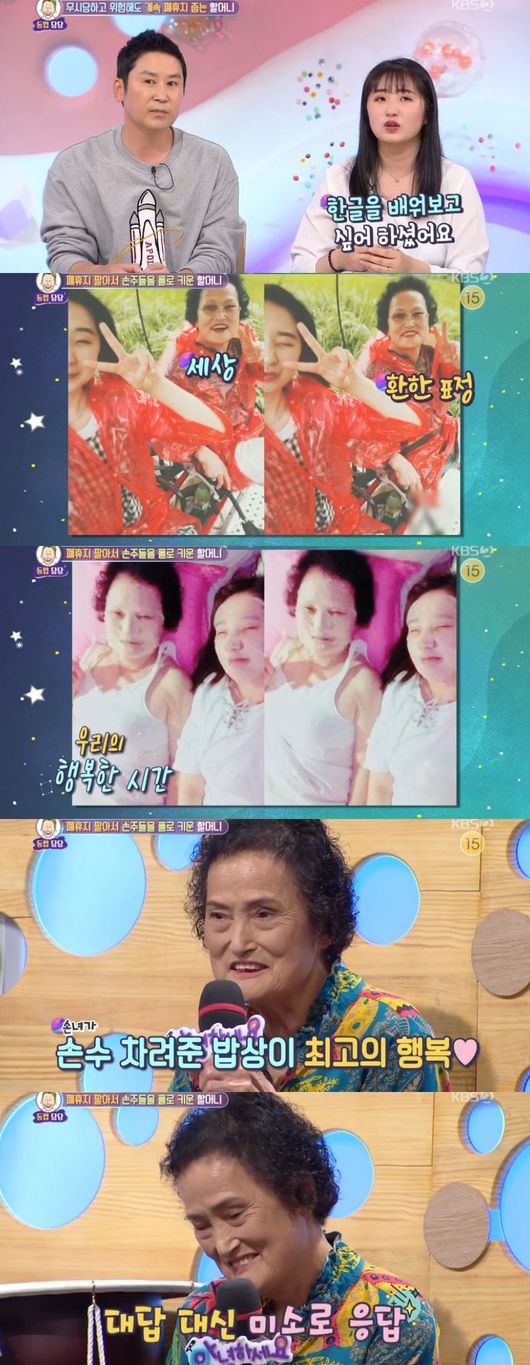 손녀는 "할머니가 노래 부르는 걸 좋아한다, 한글을 배워보고 싶어하셨다"면서 배움에도 의지가 있는 할머니가 남은 여생은 본인을 위한 삶을 사시길 간절히 바랐다. 이어 "할머니가 없었으면 나랑 동생은 어디에 있었을지도 몰랐고, 덕분에 바르게 자랄 수 있었다"며 감사한 마음을 전했다. MC들은 "손녀를 믿고 할머니 지켜봐달라, 지금까지도 충분하시다"고 했다.