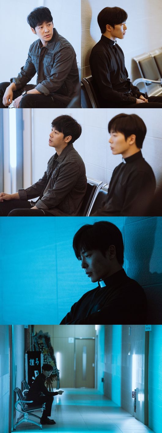 공개된 사진 속 윤화평과 최윤 사이 무겁게 내려앉은 공기가 숨 막히는 긴장감을 자아낸다. 윤화평의 거칠고 자유로운 아우라와 최윤의 묵직하고 차가운 카리스마가 범접할 수 없는 기운을 내뿜으며 시선을 사로잡는다. 최윤을 향해 무언가를 절절하게 쏟아내는 윤화평과 달리, 한 치의 흐트러짐도 없이 앞만 바라보는 최윤의 얼음장 같은 얼굴은 결코 순탄치 않을 두 사람의 공조를 예고한다. 어둠이 내린 장례식장 복도에 홀로 남은 최윤. 아무도 없을 때야 비로소 감정을 드러내는 최윤의 슬픔은 그에게 찾아온 비극의 정체가 무엇일지 궁금증을 자극한다.