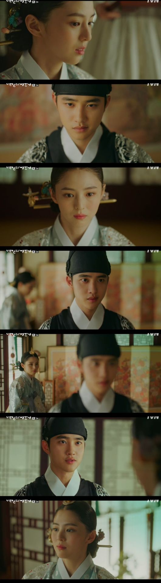 세자는 세자빈(한소희 분)을 찾아갔다. 원득은 어딘가 불안해하는 세자빈을 눈치챘다. 이어 세자빈은 의녀가 들엉자 더욱 당황했다. 세자는 "검진을 왜 두 번이나 받지 않았냐"면서 진맥을 잡으라 했다. 하지만 세자빈은 몸이 좋지 않다는 핑계로 이 위기를 넘겼으나, 원득은 살벌하게 바라봤다. 이어 자리에서 일어서더니 "빈, 다정히 손을 한 번 맞잡은 적이 없는데 해임을 하였다?"라면서 "합방을 하지 않은 안 사람이 아이를 가졌다는 절친 얘기를 들었다"며 이에 대한 빈의 생각을 물었다. 세자빈은 "어찌 그런 참담한 얘기를 내게 물으시냐"고 했다. 세자는 "역사의 기록될만하지, 더럽힐 희대의 음탕녀로"라면서 "그대와 그대의 가문은 이것으로 끝이오, 라고 말하기 전 시간을 줄 것, 함께한 세월이 있으니"라며 돌려말했다. 세자빈은 "참으로 현명하시다"며 받아쳤고, 원득은 "참으로 불행한 세자기도 하다"며 분을 삭히며 말했다.