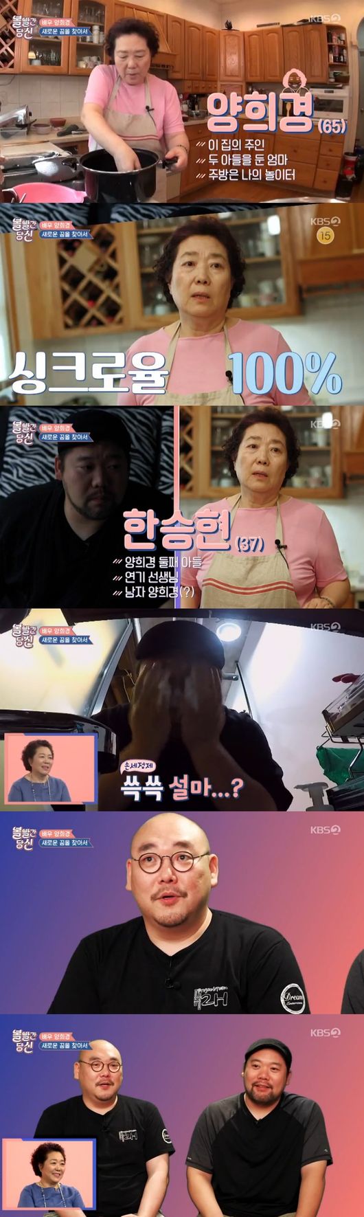 두 아들 중 둘째는 연기하는 학생들을 가르친다고 했다. 이때, 아들이 등장했고, 싱크로율 100%인 모습에 모두 깜짝 놀랐다. 양희경도 "정몰 똑같다"며 신기해했다. 연극영화과 입시철이라 더 바빠진 아들에게 양희경은 전화를 걸며 끼니를 챙겨라 당부했다. 사이좋은 모자였다. 양희경은 보리된장부터 팥장까지 직접 만들고 있었다. 이때, 큰 아들이 등장했다. 무대조명 디자인하는 큰 아들과 학생연기를 지도하는 둘째아들은 각각 자신을 소개했다.