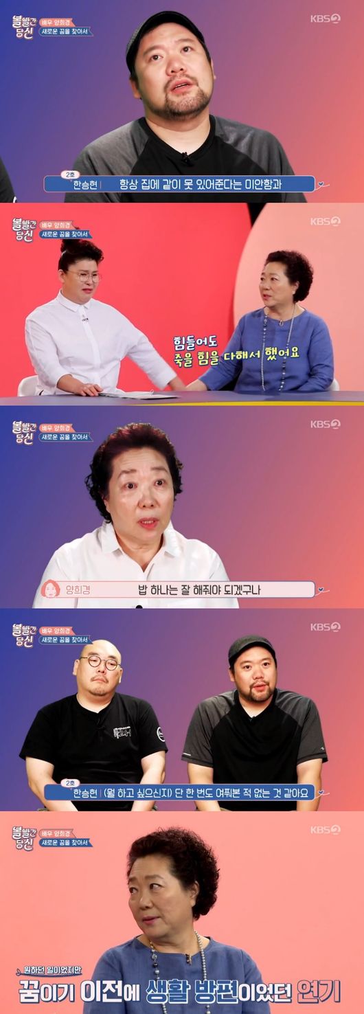 이영자는 양희경에게 연기자의 꿈을 이루지 않았냐고 묻자, 양희경은 "생활방편인 연기, 두 아들을 부양해야했던 생계수단이었다"면서 "남은 인생에 기회가 주어진다면, 조심스레 펼쳐보고 싶은 또 다른 꿈이 있다" 고 말했다.