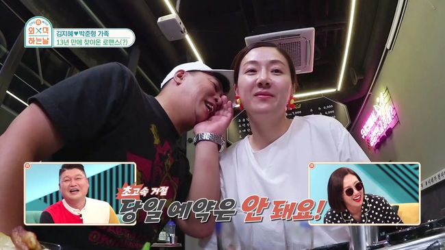 특히 김지혜는 “오늘 밤 왕으로 모실게요”라고 폭탄 발언을 해 박준형을 당황시키는가 하면, 잘 먹는 김지혜를 보고 놀라는 박준형에게 “(옷에 숨겨진 배를) 이따 보여 드릴게요”면서 아슬아슬한 멘트를 여과 없이 쏟아내 이목을 집중시켰다. 하지만 박준형은 “당일은 안된다”며 “적어도 3일 전에 사전 예약해야 한다”고 답변해 스튜디오를 초토화로 만들었다.